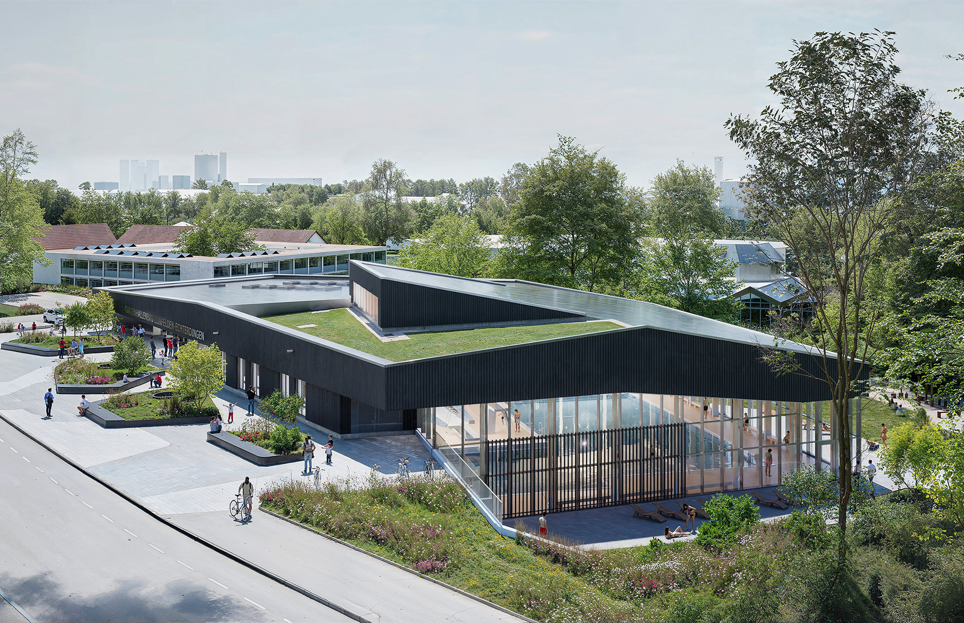 “The architects have come up with an indoor garden pool that boosts the collective harmony of the neighboring landscape characterized by detached structures, while exhibiting a singular architectural identity. In doing so, the structure aptly responds to the topographical situation: A suitably proportioned structure faces the street, displaying a distinct entrance that effortlessly beckons visitors inside thanks to its well-designed dimensions. Facing the urban park, the building seamlessly integrates the neighboring open spaces into its architectural concept, forging harmonious relationships.