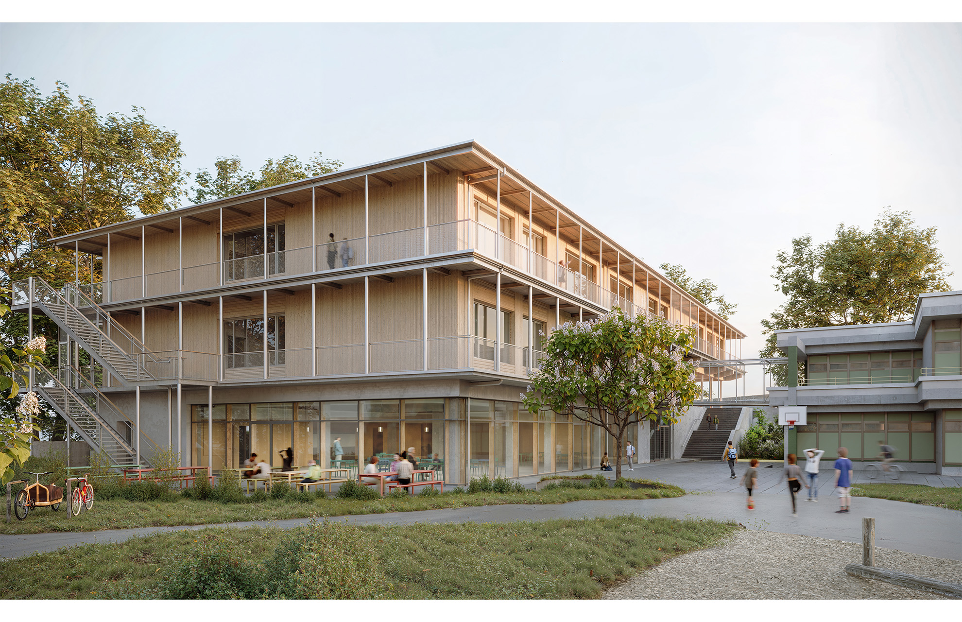 Die Greutschule Aalen ist mit Ihrem Ganztagesbetrieb und der Vierzügigkeit eine der größten selbstständigen Grundschulen im Ostalbkreis. Um weiterhin den wachsenden Anforderungen und höheren Schülerzahlen gerecht zu werden, ist ein Neubau auf der südlichen angrenzenden Grünfläche dringend erforderlich. Vom Westen kommend wird die Eingangssituation zum Ort der Begegnung an gut gesetzter Stelle und sorgt für störungsfreies Lernen und Lehren im Rest des Gebäudes. Betritt man hier das Gebäude so empfängt einen ein mit Tageslicht durchfluteter Foyer-Bereich in angemessener Größe. Oberlichter versorgen die Geschosse mit Tageslicht von oben. Von hier findet man auc direkt der Weg zur Mensa. Ein Verbindungssteg zum bestehenden Hauptgebäude sorgt dafür, daß der neue Ganztagesbereich und die Mensa gut an das Bestandsgebäude angebunden werden. Das Gebäude wird in Holzbauweise erstellt.